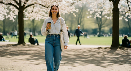 A young woman walks in a park during springtime, smiling and holding a coffee cup.