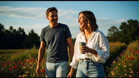 Beautiful young couple in love walking in the field and drinking coffee