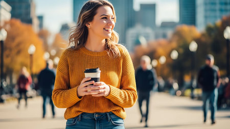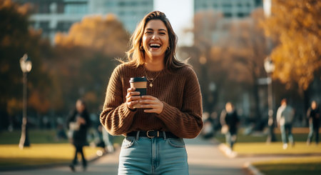 A joyful woman in a brown sweater and blue jeans walks in a park, holding a coffee cup, with autumn trees and city buildings in the background.