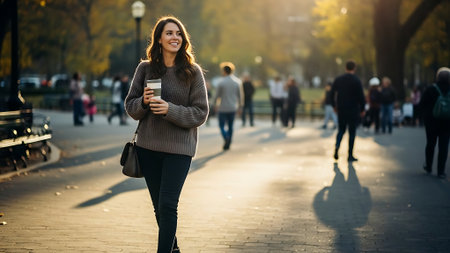 A smiling young woman walks in a park on an autumn day, holding a coffee cup and wearing a brown jacket, jeans, and carrying a bag, surrounded by trees with yellow leaves.
