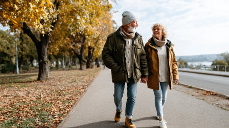 A joyful senior couple walks hand in hand through a picturesque park during autumn, surrounded by vibrant trees and fallen leaves, enjoying their time together.