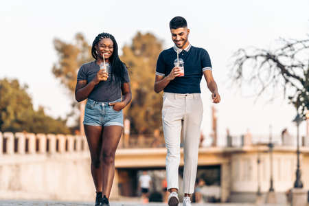 Two people of different ethnicities walking while drinking a shake outdoors