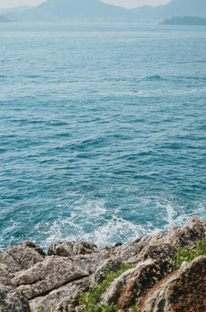 view from a cliff to the Adrian sea with waves in Montenegro with the city of Budva and mountains