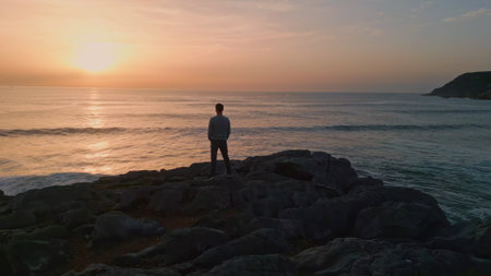 Dark silhouette enjoying sunrise ocean horizon at volcanic cliffs back view. Unrecognizable tourist man watching panoramic dawn marine landscape. Morning sun beams reflecting in calm lapping water