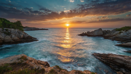 Beautiful sunset over the sea. Panoramic view of the sea at sunset.
