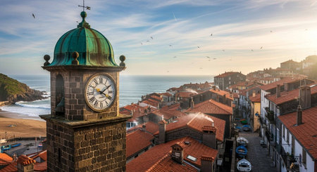 Landscape with a small village, hill, forest, sea and blue sky with clouds. Basque Country, Spain. Camino de Santiago