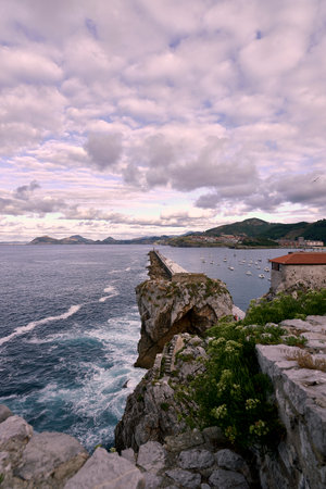 view from a viewpoint with a wooden fence of the cantabric sea and the island of Aquech or Aqueche island from bilbao and near San Juan de Gastelugaxe tourist place of Spain on a summer day.