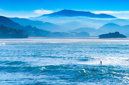 Beautiful landscape with foggy blue hills, ocean, and man on a surfboard