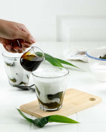 Pour Liquid Palm Sugar to the Glass with Green Grass Jelly Drink or Cingcau Hijau. Cincau Ijo is Popular Street Food from Indonesia for Breaking the Fast