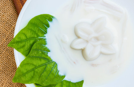 Delicious Thai pudding with coconut topping in a banana leaf cup garnished with butterfly pea flower