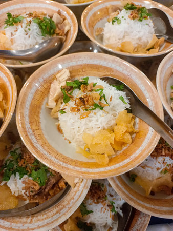 A Javanese breakfast dish of rice cake egg bean curd jicama in spicy coconut milk broth. Served with crispy crackers on top.