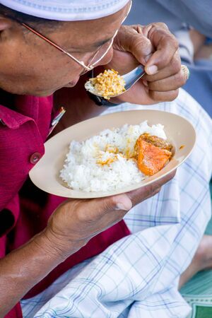 Asian man sitting on the floor, eating rice with beef curry and potato