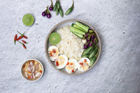 Brown rice dish with boiled eggs chili line has cucumber eggplant vegetable in bowl isolated on white slate background close up, top view, healthy food concept.