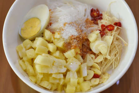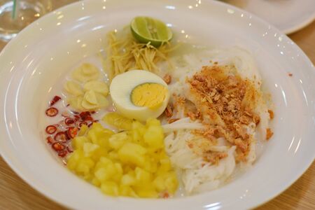 Side view of noodle tangy fish gravy or Laksa Utara. Special Malaysian food especially in Penang district