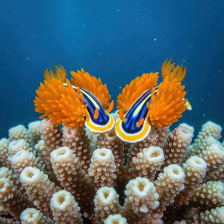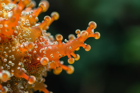 A close-up view of a brightly colored orange coral polyp, showcasing its intricate tentacles and delicate structure in stunning detail.