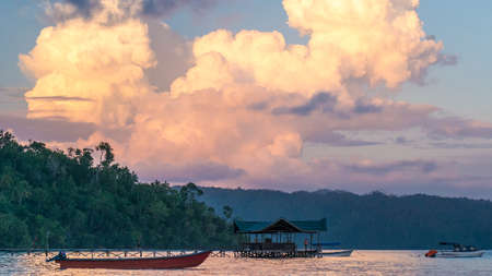 Huge White Clouds above Diving Station on Sunset, Homestay Gam Island, West Papuan, Raja Ampat. Indonesia