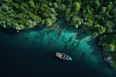 Aerial view of a boat on the blue sea with green trees in the background