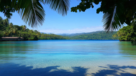 A breathtaking view of a tranquil tropical lagoon featuring clear blue waters surrounded by verdant palm trees and mountains, inviting relaxation and adventure.