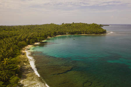 Aerial view of beautiful tropical island with palm trees and turquoise sea. Drone photography.