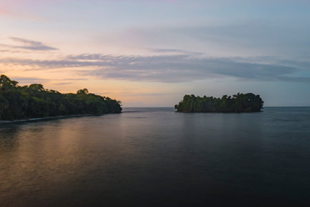 Tropical landscape with mangrove trees in blue ocean and sunrise or sunset.