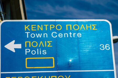 Paphos Cyprus March 11, 2020 View of street sign in the city of Paphos in the afternoon