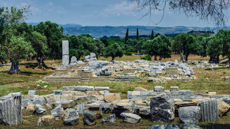 View of the ruins on the island of Delos, Greece, an archaeological site near Mykonos in the Aegean Sea Cyclades archipelago.