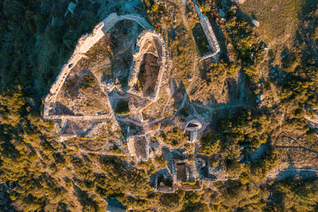 Aerial view of a Medieval ruined stone castle on the mountain, Aumelas Castle in France