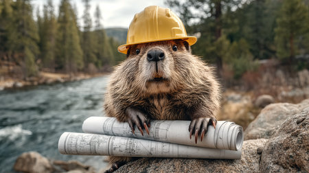 A beaver in a bright construction helmet carefully inspects architectural blueprints at a building site during daylight.
