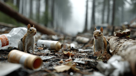 This image captures two squirrels in a littered forest setting. The scene highlights the contrast between wildlife and environmental pollution in a misty atmosphere.