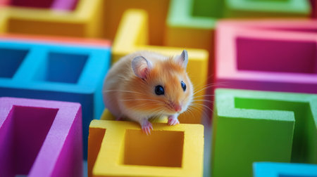 A hamster exploring a colorful maze, trying to find its way out with curiosity.