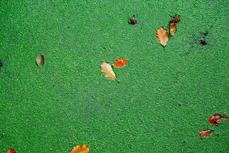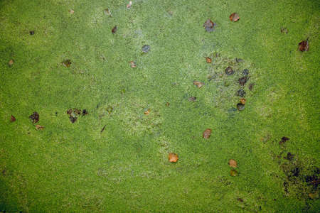 Water surface covered by duckweed and dried leaves for nature background