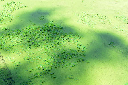 Green duckweed on the surface of the water in the garden.