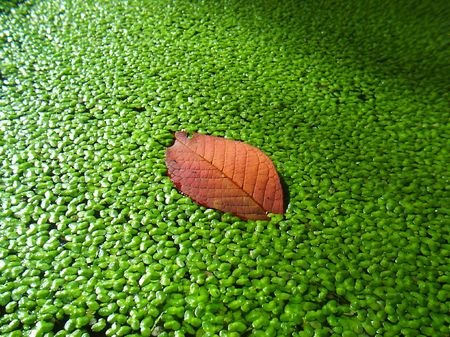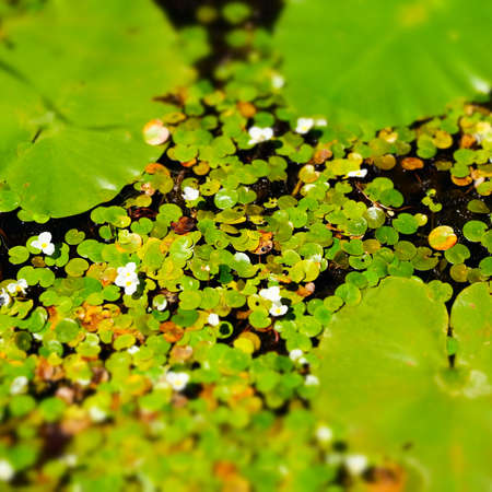 Green duckweed on water and lily leaf