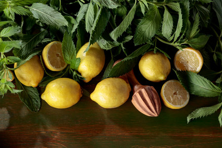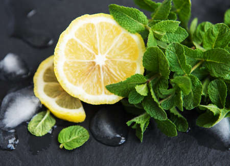 Fresh mint and lemon slices on rustic background. Mohito cocktail ingredients. Lemonade ingredients