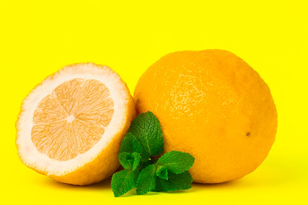 Lemon with mint, on a yellow background, concept, horizontal, no people ,. High quality photo,