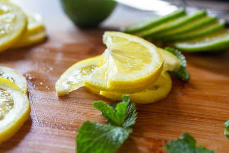 fresh sliced limes and fresh green mint leaves, making cocktail or lemonade, on wooden board. Top view.