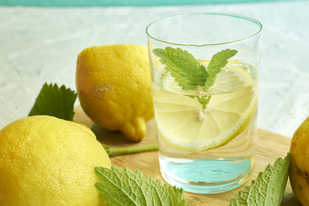 sliced lemon with mint and ice on the turquoise surface of the table, close-up