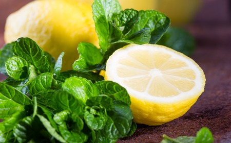 Multiple fresh leafs of peppermint on blue and yellow background with slices of lemons