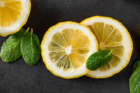 Fresh juicy lemon slices on a black background. Cocktail ingredient - mint leaves and lemon. Water drops on a ripe lemon. Food background.