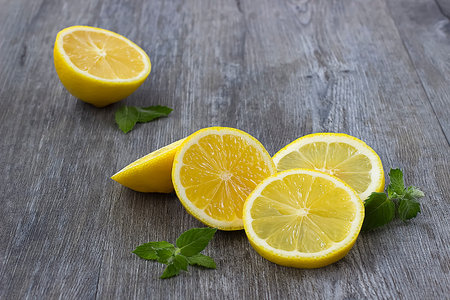 Fresh sliced lemon and mint on a gray wooden background. Soft focus.