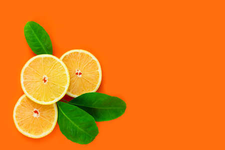 Lemon fruit, citrus minimal concept, vitamin C. Creative layout made of lemon and leaves, half of lemon, slide, piece.