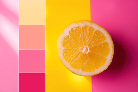 A vibrant lemon half contrasts beautifully with a gradient spectrum of pink, peach, and yellow hues, creating a stunning visual feast for the eyes. Generated AI