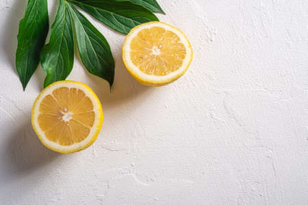 Two lemon slices, tropical citrus fruits with green leaves on white concrete background, top view copy space
