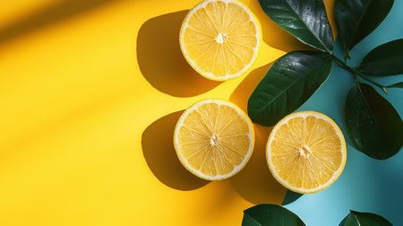 Freshly cut lemon halves arranged with green leaves on a bright yellow and teal background. The composition creates a striking contrast with natural sunlight and shadows adding depth.