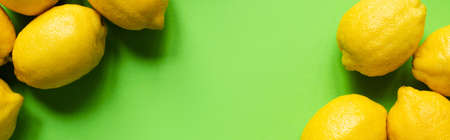 Yellow lemons on green pastel background, concepts,summer ideas of fruit, vegetable, healthy eating lifestyle, flat lay, copy space