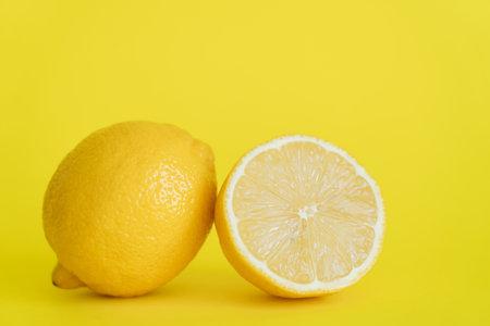 Fresh sliced lemon on yellow background with copy space for your text. Lemons fruits. Juicy slice of lemon on yellow background.