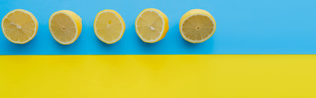 Top view of lemon half on blue, orange and white background, panoramic shot