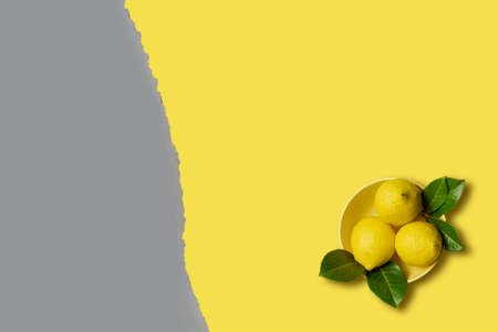 Lemons and green leaves yellow bowl on yellow background with cope space. High quality photo