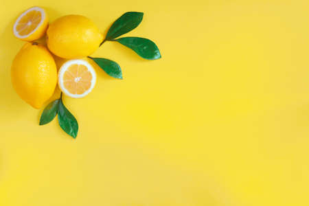 Composition of lemons, slices, green leaves are laid out in triangle on upper left corner of yellow background. Citrus fruit for preparing cocktails, beverages, drinks. Vitamin C concept.