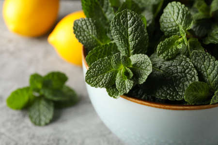 Bowl with mint and lemons on grey background, close up